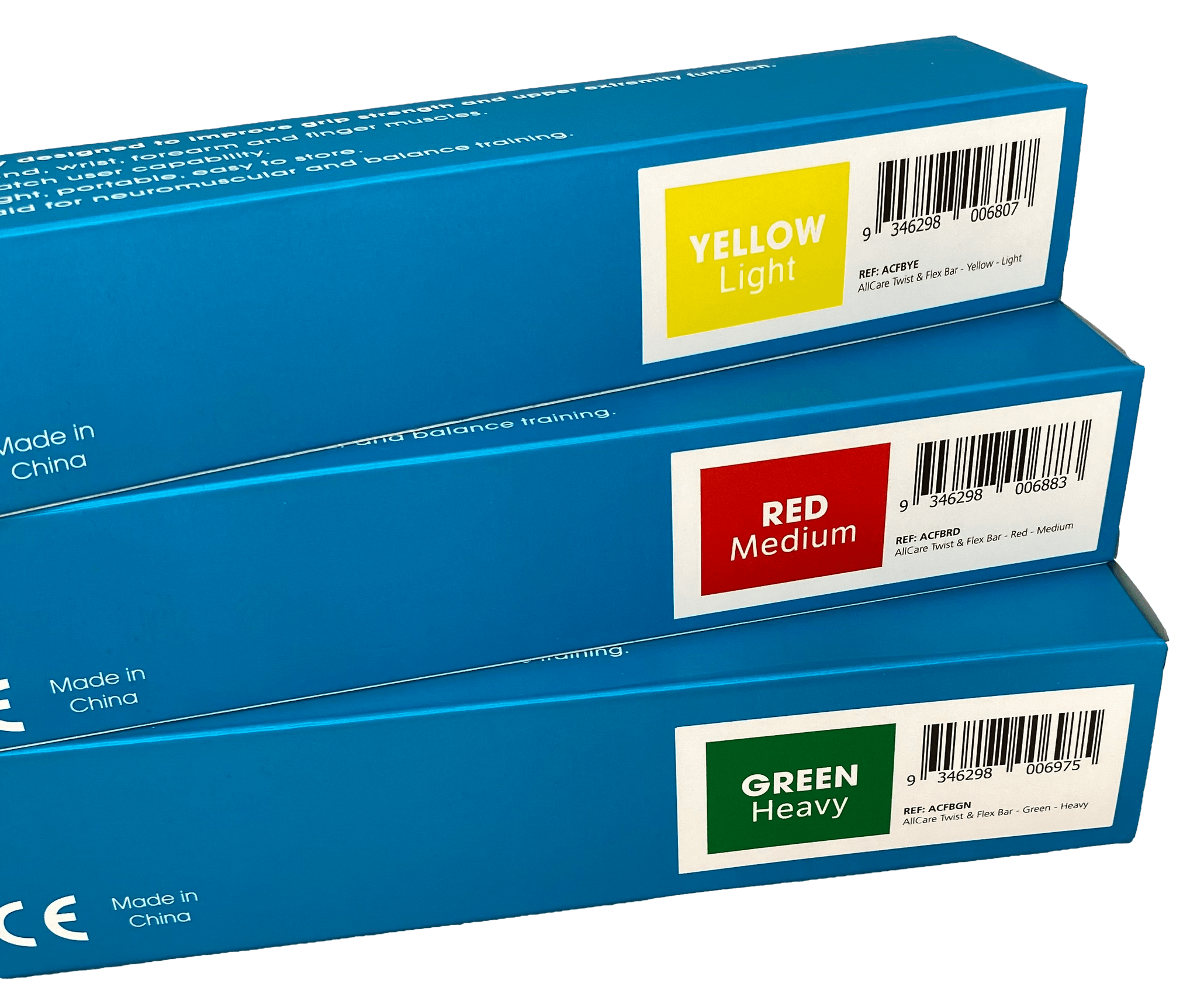 The Allcare Flexibar is available in three colour coded progressive resistance strengths to reflect user capability: Light (Yellow) Medium (Red) and Heavy (Green). Each bar measures 31cm in length and has a ridged surface for enhanced grip during use.