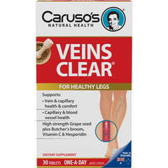 VEINS CLEAR FOR HEALTHY LEGS Supports: Vein & capillary health & comfort • Capillary & blood vessel health • High strength Grape seed plus Butcher's Broom, Vitamin C & Hesperidin Warnings Use only as directed. If symptoms persist see your Healthcare Professional. Vitamins should not replace a balanced diet. Free from: sugar, dairy, lactose, yeast, wheat, salt, animal products, soy, gluten or preservatives. Common Uses Vein structure is important for healthy legs Caruso's Veins Clear formula is specifically designed to support blood vessels and vascular tone for healthy vein structure. Caruso's Veins Clear supports the integrity of vein and capillary walls. Caruso's Veins Clear contains Grape seed extract, to support healthy capillaries and blood vessels. The Ruscus, Vitamin C and Hesperidin in Caruso's Veins Clear, support strong capillaries and veins and acts as a Venotonic, to support venous tone and blood flow. Help vein strength and elasticity Collagen is an important structural component of blood vessels. Vitamin C is important for the synthesis of collagen, whilst Grape seed extract may protect against the destruction of the collagen in your blood vessels. Leg comfort. The Ruscus, Vitamin C and Hesperidin support leg comfort for tired and heavy legs Ruscus specifically supports comfort. Whilst Vitamin C helps protect against collagen breakdown in the blood vessels. To support vein and capillary health, try Caruso's Veins Clear. Ingredients Active Ingredients. Each tablet contains: Vitis vinifera (Grape seed) Extract equiv. to dry seed 22.11g (22,105mg) Standardised to Procyanidin 175mg Ruscus aculeatus (Butcher's Broom) Extract equiv. to dry root and rhizome 1.54g (1540mg) Standardised to Ruscogenin 22mg Hesperidin 300mg Ascorbic Acid (Vitamin C) 200mg Directions Adults take 1 tablet after breakfast or as advised by your Healthcare Professional.