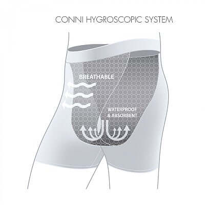Conni waterproof, absorbent, and reusable men's undergarments are designed to absorb and protect. Conni Classics feature our four layer protection from the front waistband all the way to back waistband.