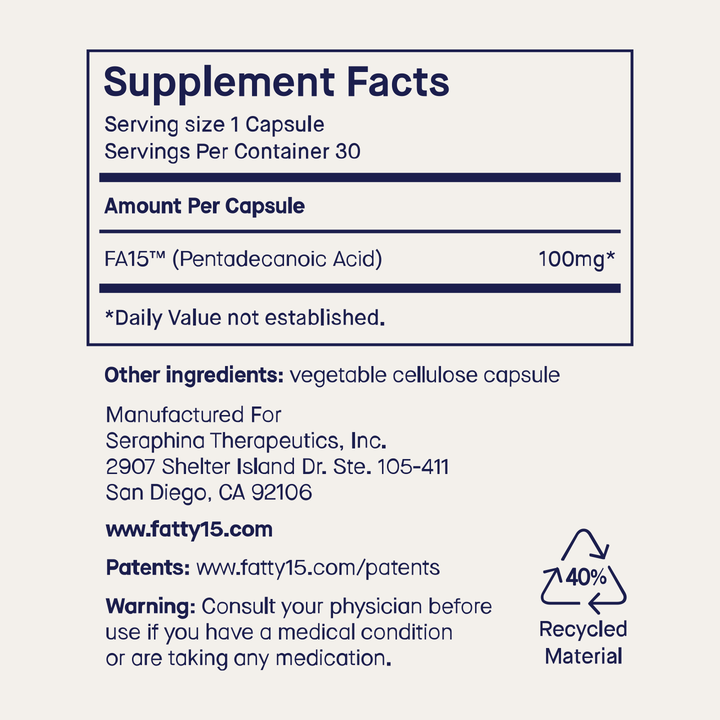 Fatty15 is a science-backed, patented and award-winning supplement containing pure C15:0 (pentadecanoic acid) - a crucial fatty acid that strengthens our cell membranes against lipid peroxidation and slows aging at the cellular level. The result? Staying healthier, longer.
