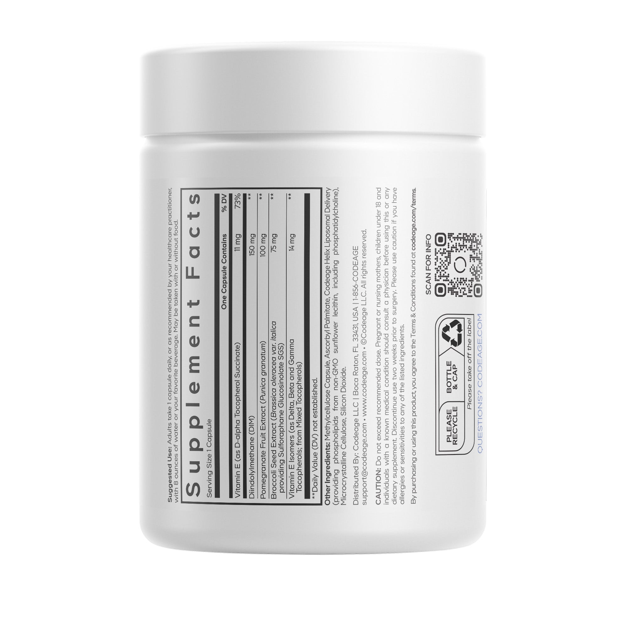Vitamin E (as d-Alpha Tocopherol; from Rice Bran), Diindolylmethane (DIM), Pomegranate Fruit Extract (Punica granatum), Broccoli Seed Extract (Brassica oleracea var. italica providing Sulforaphane Glucosinolate SGS), Vitamin E Isomers (Beta, Gamma, and Delta Tocopherol; from Rice Bran). Other Ingredients: Methylcellulose Capsule, Non-GMO Sunflower Oil (containing Phosphatidylcholine; Liposomal Delivery Matrix).