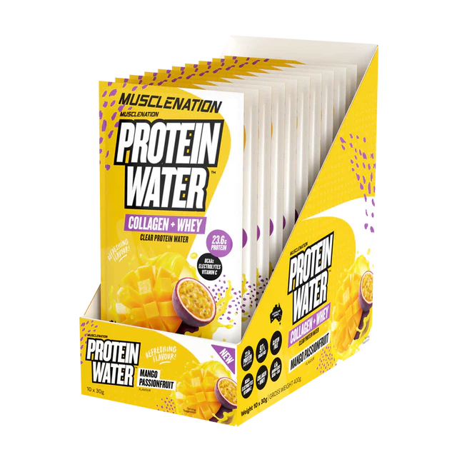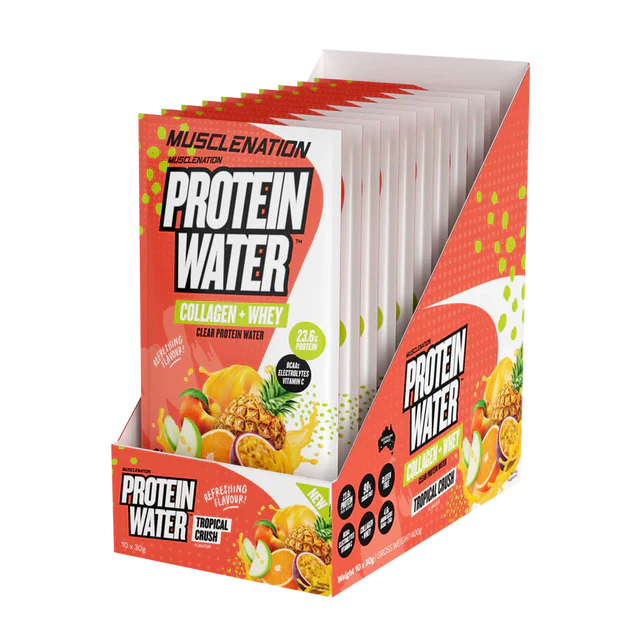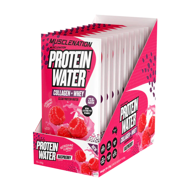 A refreshing clear protein water supplement which is a light alternative to the usual milky protein shake. With the benefits of protein, collagen, electrolytes and BCAA's, the Muscle Nation Protein Water is a fruity and thirst-quenching drink to use any time of the day.