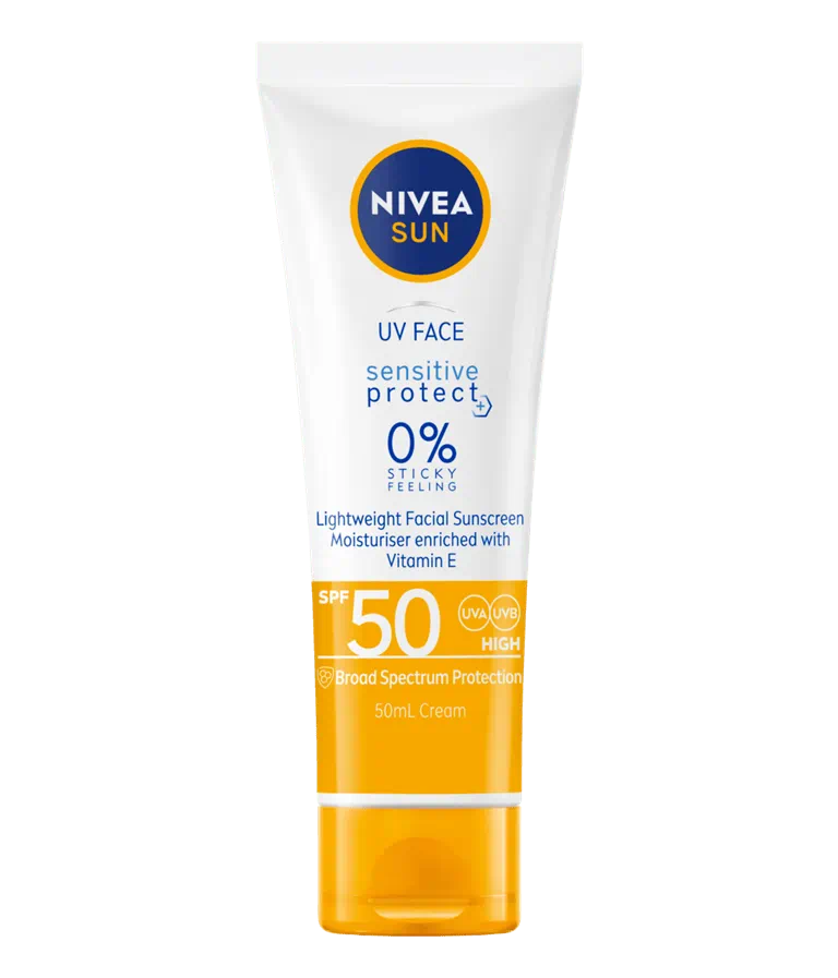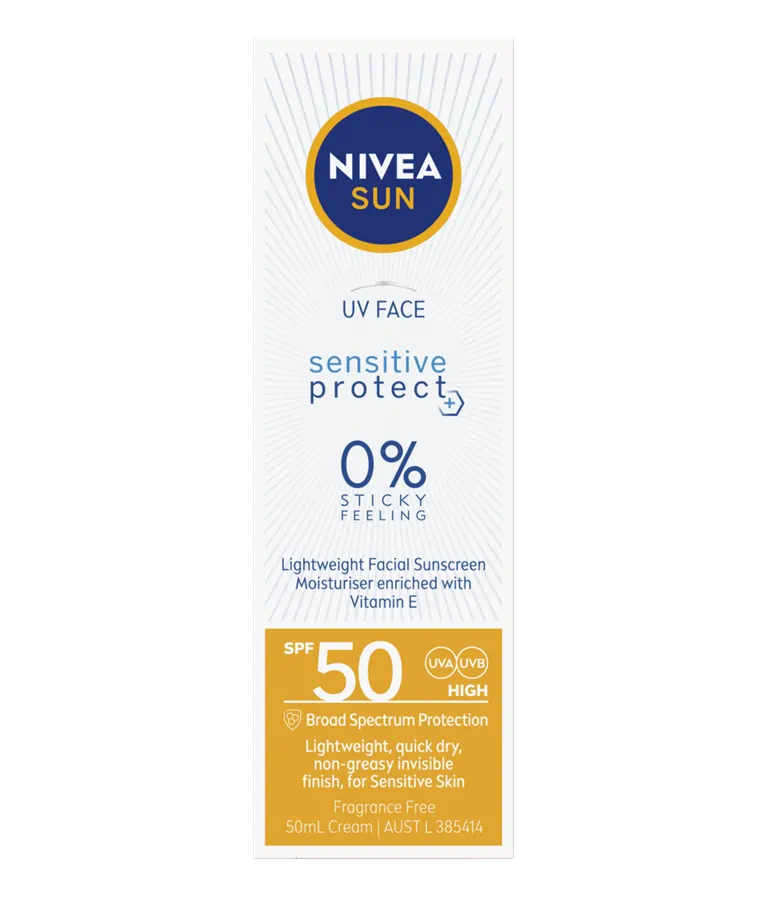 NIVEA SUN UV Face Sensitive Protect SPF50 Cream is formulated for those with sensitive skin to protect against UVA and UVB rays and offers Broad Spectrum SPF50 Protection. Made especially for the delicate skin on your face, enjoy the sun with quality care using NIVEA!