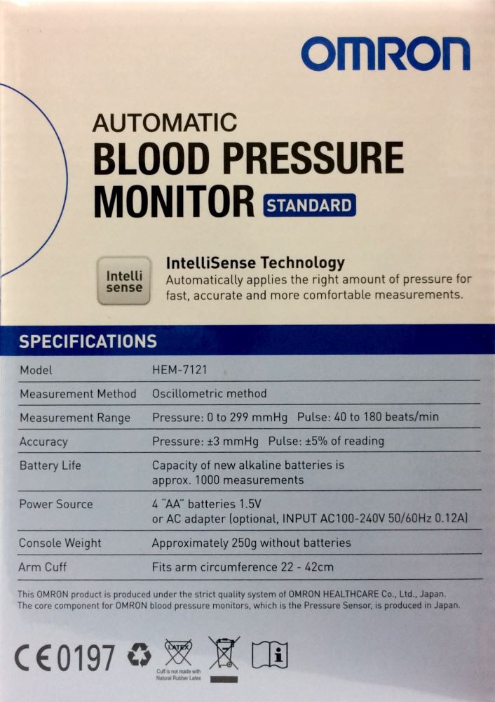 Omron Standard Blood Pressure Monitor HEM-7121 The Omron Standard blood pressure monitor provides simple and accurate blood pressure readings without compromising user comfort.
