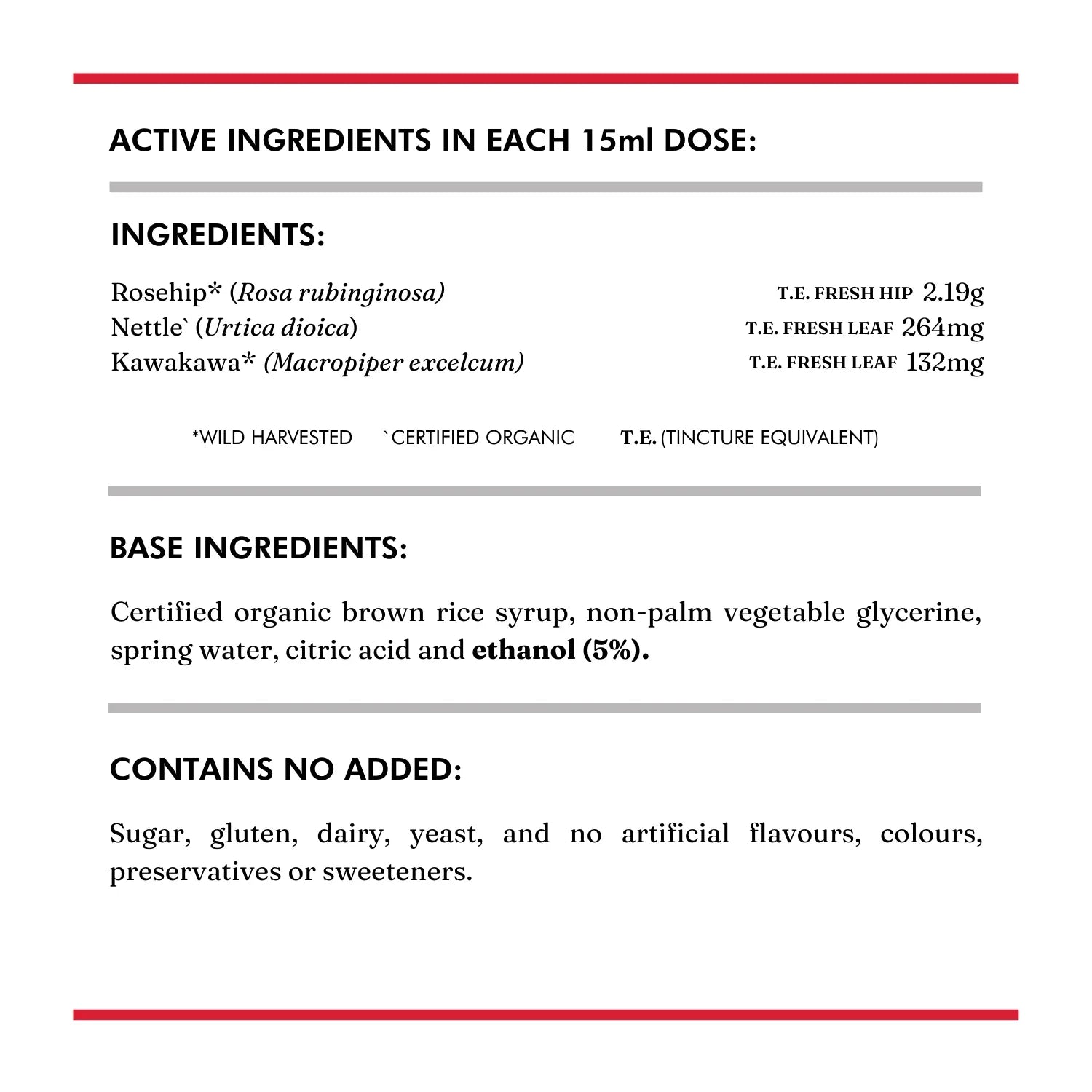Feeling depleted? Our Daily Boost Tonic is perfect if you want to feel revitalised. A careful blend of rosehips, nettle, and kawakawa provides a rich source of plant-based vitamins and minerals to support your overall well-being.
