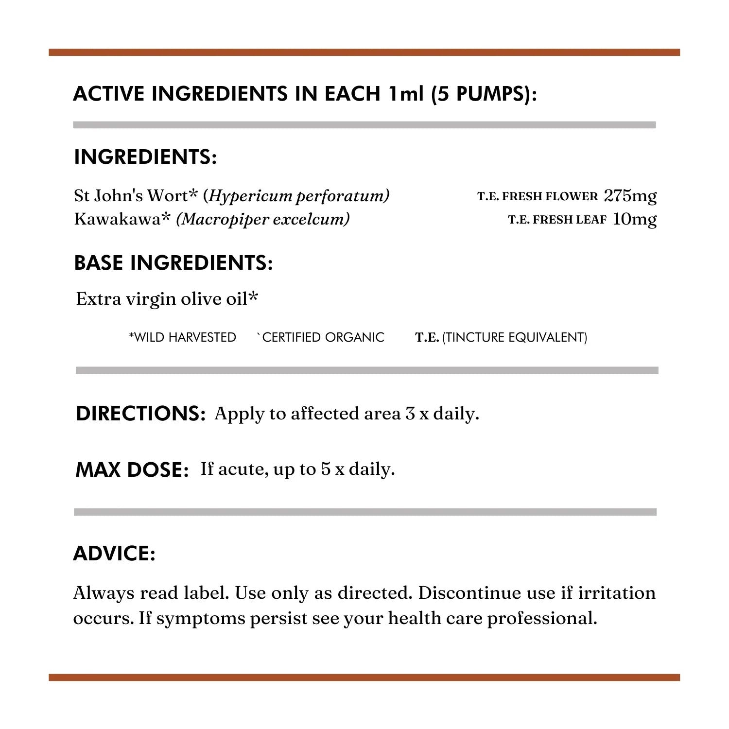 Infused with wild-harvested St. John’s wort and native kawakawa, this is a soothing, restorative, and moisturising oil that is great for sunburns, itchy bites and dryness, as well as the bumps and bruises that come with life’s adventures. Our Golden Skin Oil can also support you if you suffer from sciatica or muscular discomfort.
