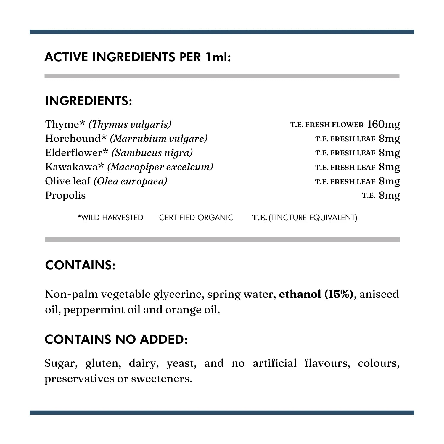 If you’re busy, you know how convenient it is to have immune support on-the-go. That’s why we created our Vira Defence Elixir. This compact dropper is packed with thyme and propolis for a powerful first immune response. Thyme is well-known for its anti-viral properties and its ability to support respiratory health, while propolis provides a natural boost to your immune system. With a synergy of other respiratory herbs, this elixir has everything you need to stay healthy and strong - not matter where you are.