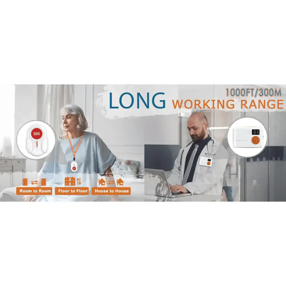 Effective Wireless Coverage: This caregiver pager offers a reliable wireless connection with a range of up to 300mtrs, ensuring seamless communication between caregivers and elderly individuals, even in large spaces.